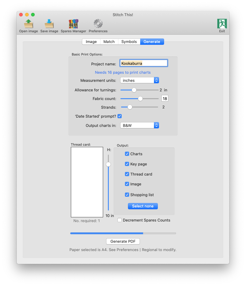 If you choose to utilise the Thread Card organiser for your project, here you can specify the height it will be output - this enables you to set its size so that it will fit within the tin or other container in which you keep your materials while you're working on your project. If that makes it is too small to fit all the colours on, it will generate more than one.