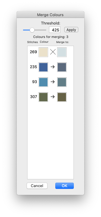 Clicking on Cancel will reject all substitutions and retain the image as it is now. Clicking OK will merge those colours with an arrow present, and ignore those with an ╳ .